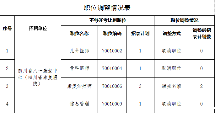 因无人报考或报考人数未达到规定的开考比例,经研究,取消四川省八一康复中心(四川省康复医院)儿科医师等3个招聘职位(3个招聘名额),调减该单位康复治疗师招聘职位1个招聘名额。详细情况见下表。