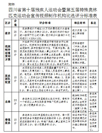 附件:四川省第十届残疾人运动会暨第五届特殊奥林匹克运动会宣传视频制作机构比选评分标准表